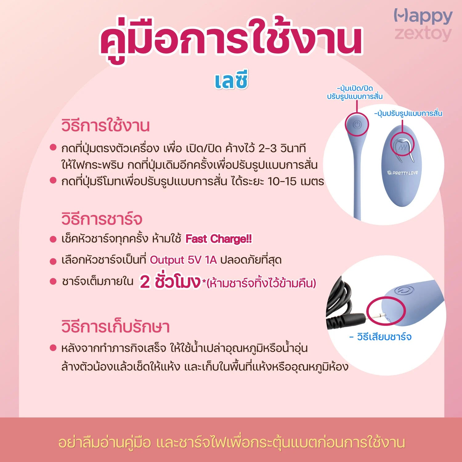 การเปิด/ ใช้งาน กดปุ่มค้างที่ตัวเครื่อง 2-3 วินาที ให้ไฟกระพริบ กดอีกครั้งเพื่อเปลี่ยนระดับแรงสั่น หรือกดที่รีโมท
