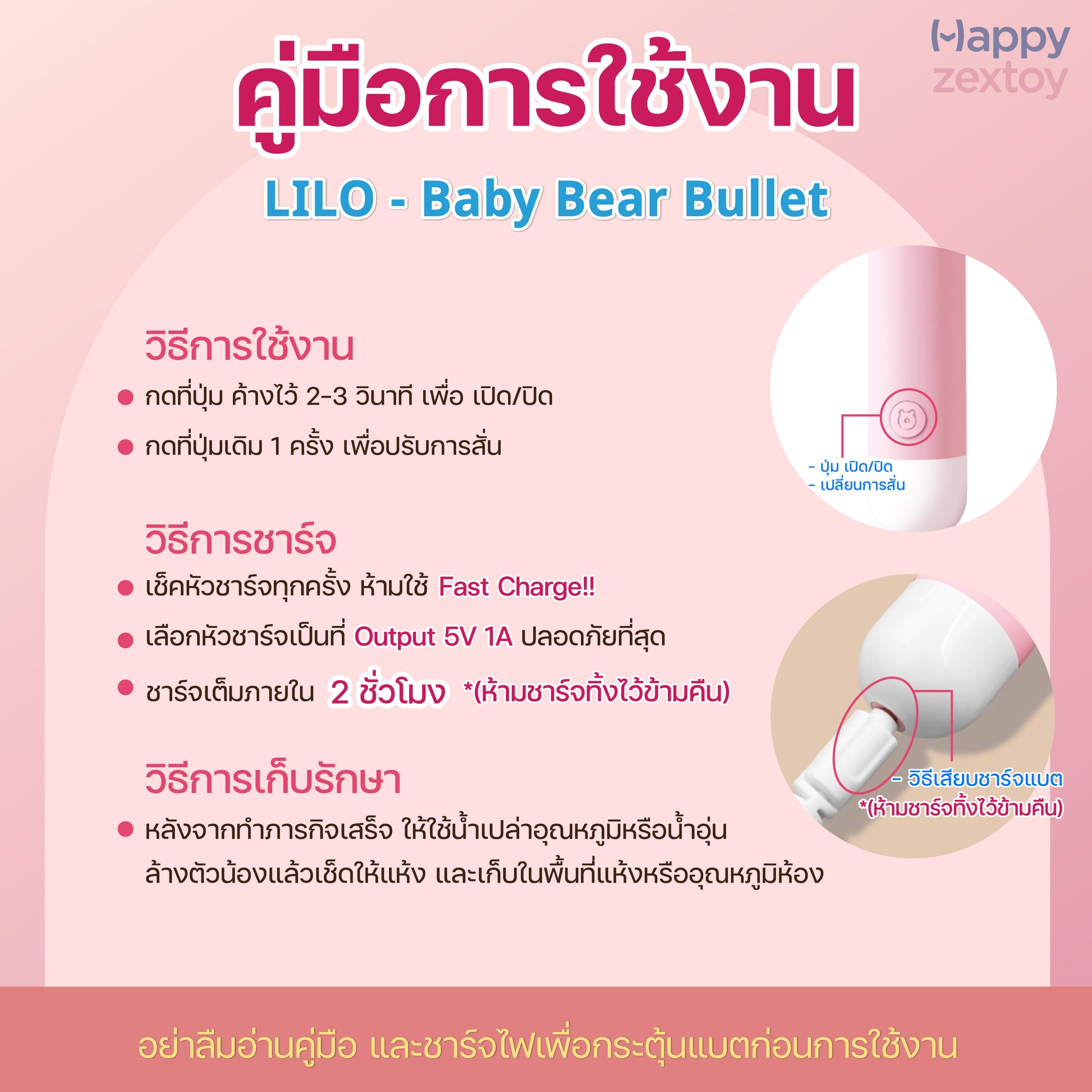 การทำความสะอาดก่อน/หลังการใช้งาน : ทำความสะอาดด้วยเจลอาบน้ำเด็ก หรือน้ำยาทำความสะอาดจุดซ่อนเร้น ด้วยน้ำเปล่าอุณหภูมิปกติหรือน้ำอุ่น เช็ดทำความสะอาดให้แห้งทุกครั้ง หลังการใช้งาน เพื่อยืดอายุการใช้งาน