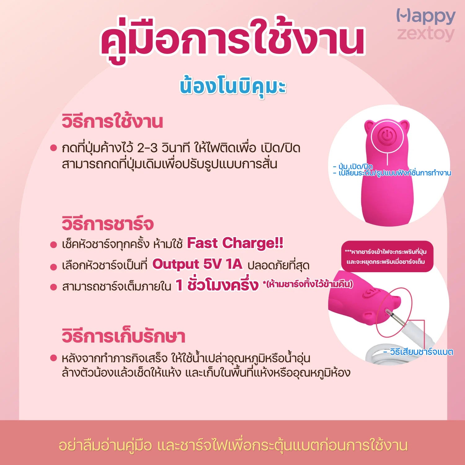 การทำความสะอาดก่อน/หลังการใช้งาน : ทำความสะอาดด้วยเจลอาบน้ำเด็ก หรือน้ำยาทำความสะอาดจุดซ่อนเร้น ด้วยน้ำเปล่าอุณหภูมิปกติหรือน้ำอุ่น เช็ดทำความสะอาดให้แห้งทุกครั้ง หลังการใช้งาน เพื่อยืดอายุการใช้งาน